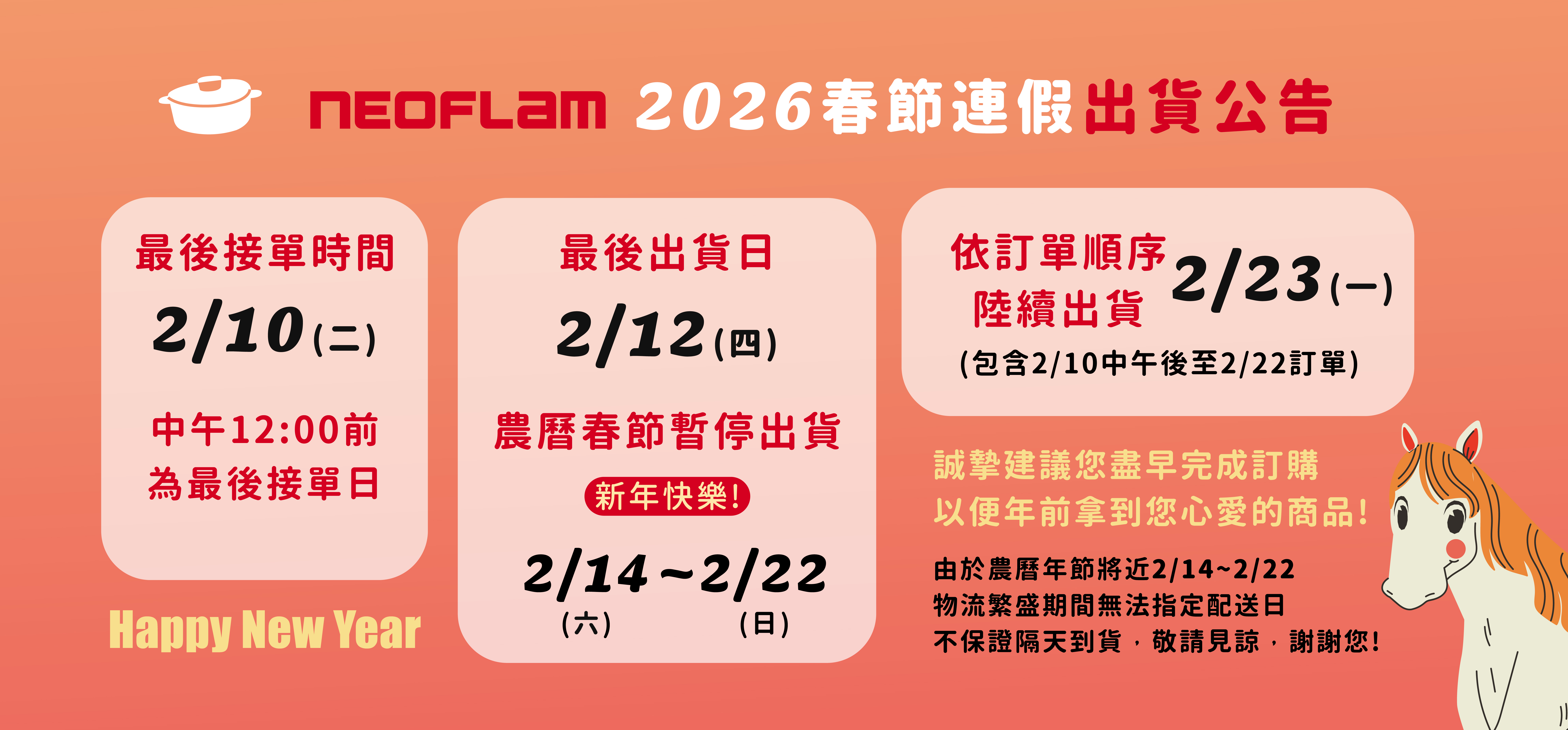 ✨𝟐/𝟏𝟐-𝟐/𝟐𝟐 農曆春節暫停出貨! 上班日 :𝟐/𝟐𝟑(一)依訂單順序出貨