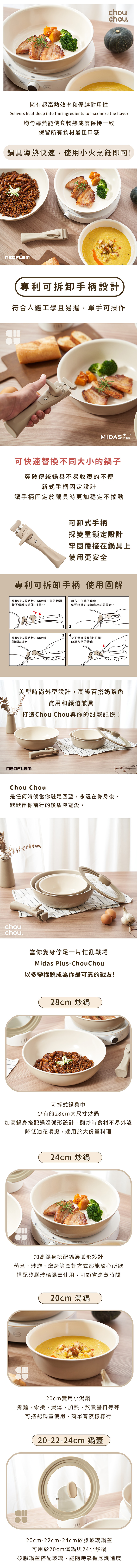 ●可拆卸式手柄設計搭配多種鍋身,根據不同料理需求變換