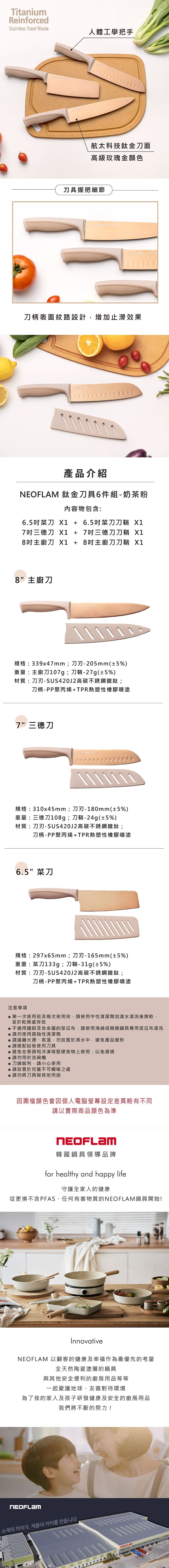 規 格:6.5吋菜刀-297x65mm;7吋三德刀-310x45mm;8吋主廚刀-339x47mm