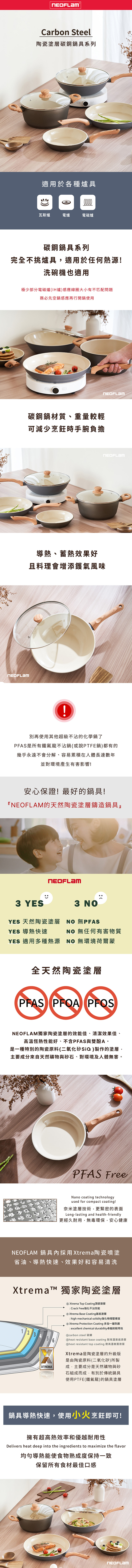 ●碳鋼材質,輕巧耐用,導熱快速均勻,小火烹飪節約能源,保留食材營養與原味