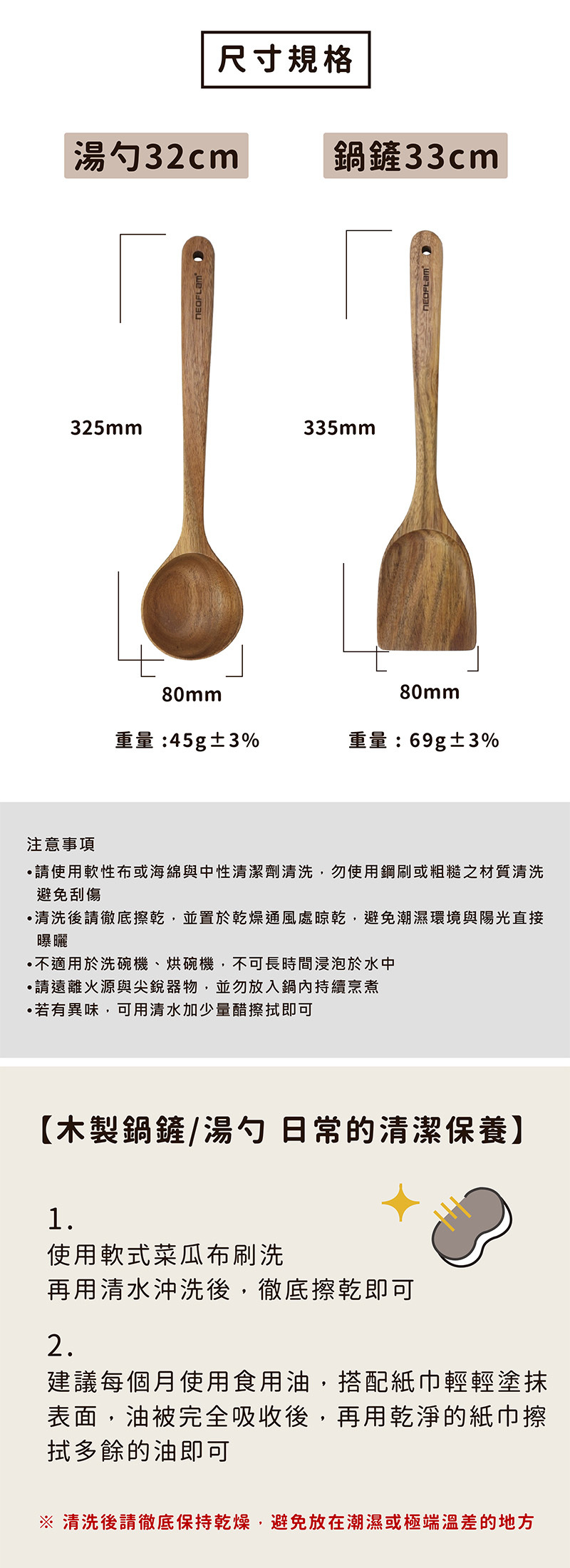 ●不適用鐵刷、含金屬之菜瓜布、金屬鍋鏟,建議使用海綿、精緻鍋具專用菜瓜布、木鏟或矽膠鏟,清洗後請徹底擦乾,延緩金屬氧化,可延長鍋具使用壽命