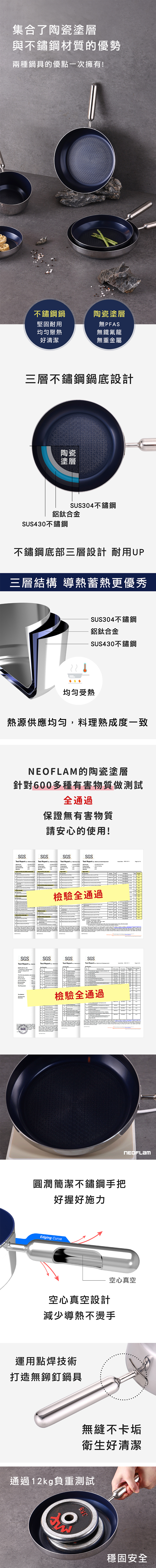 材 質:鍋身-鍋內SUS304不鏽鋼(陶瓷噴塗);特殊鋁鈦合金芯;鍋外SUS430不鏽鋼(鍋柄-不鏽鋼