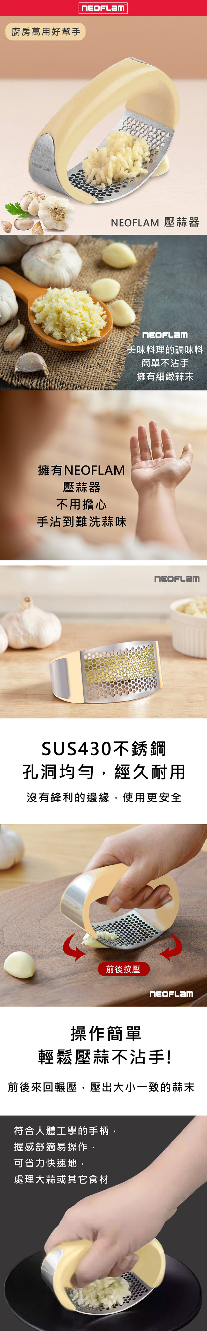 ● 人體工程學設計:符合人體工程學的弧形手柄設計,易於操作,握感舒適可以更方便快捷地處理大蒜或其它食材。