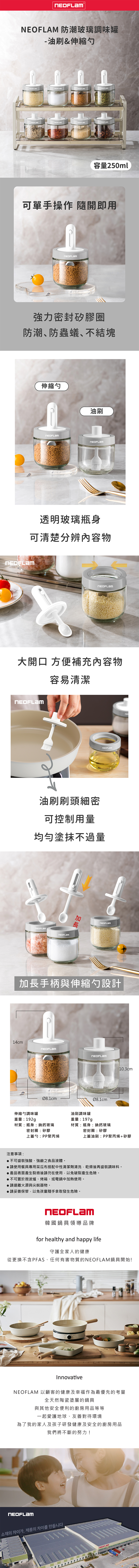 ● 加長手柄與伸縮勺設計,可挖取任何高度調味料,使用方便。 ● 透明玻璃瓶身,可清楚分辨內容物。
