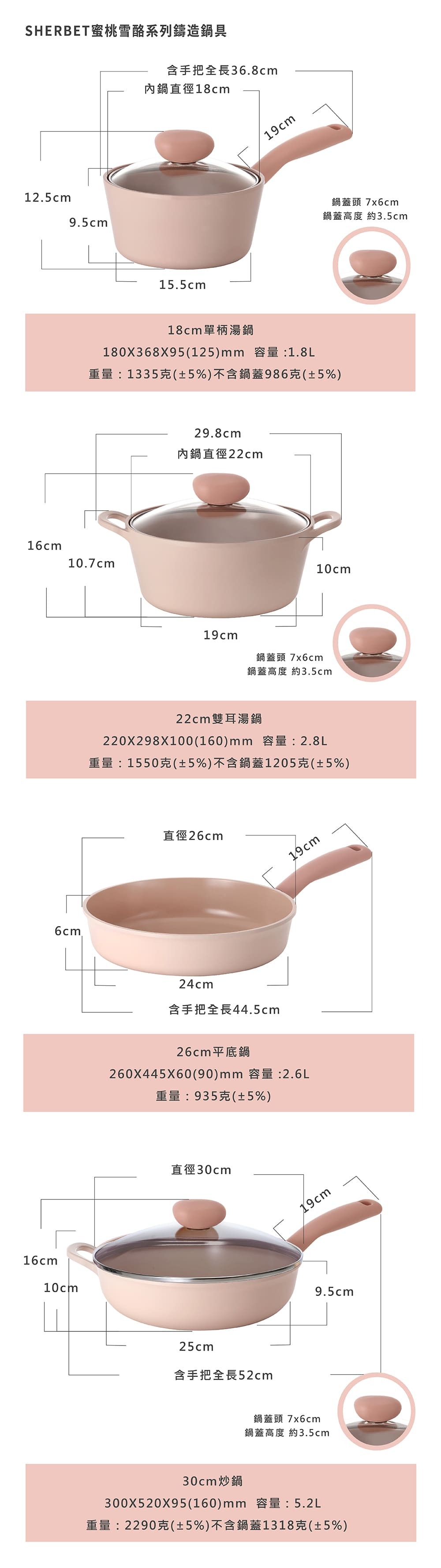 品 名:Sherbet系列22cm雙耳湯鍋+玻璃蓋-蜜桃雪酪