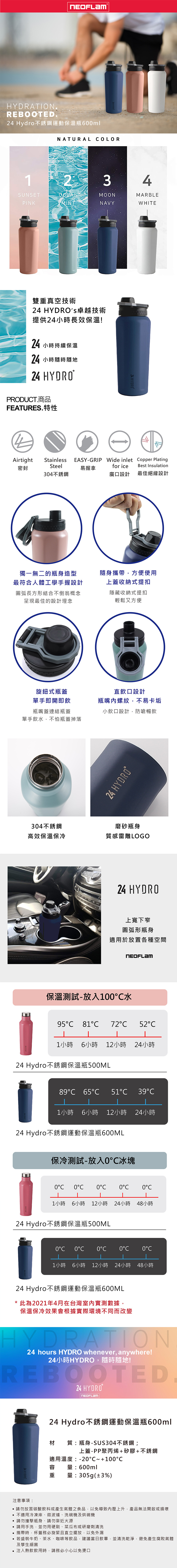 Neoflam 24 Hydro不銹鋼運動保溫瓶600ml- 深藍
